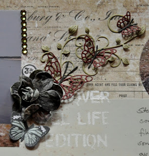 First of the flower- and butterfliescluster on the left side. Here you can also see some of the treatment of the background. I used stencils with gesso, stamps and mists on the background, after putting on the strip of cardstock to the patterned papers. I used two different patterned papers from the same line from Blue Fern Studio.